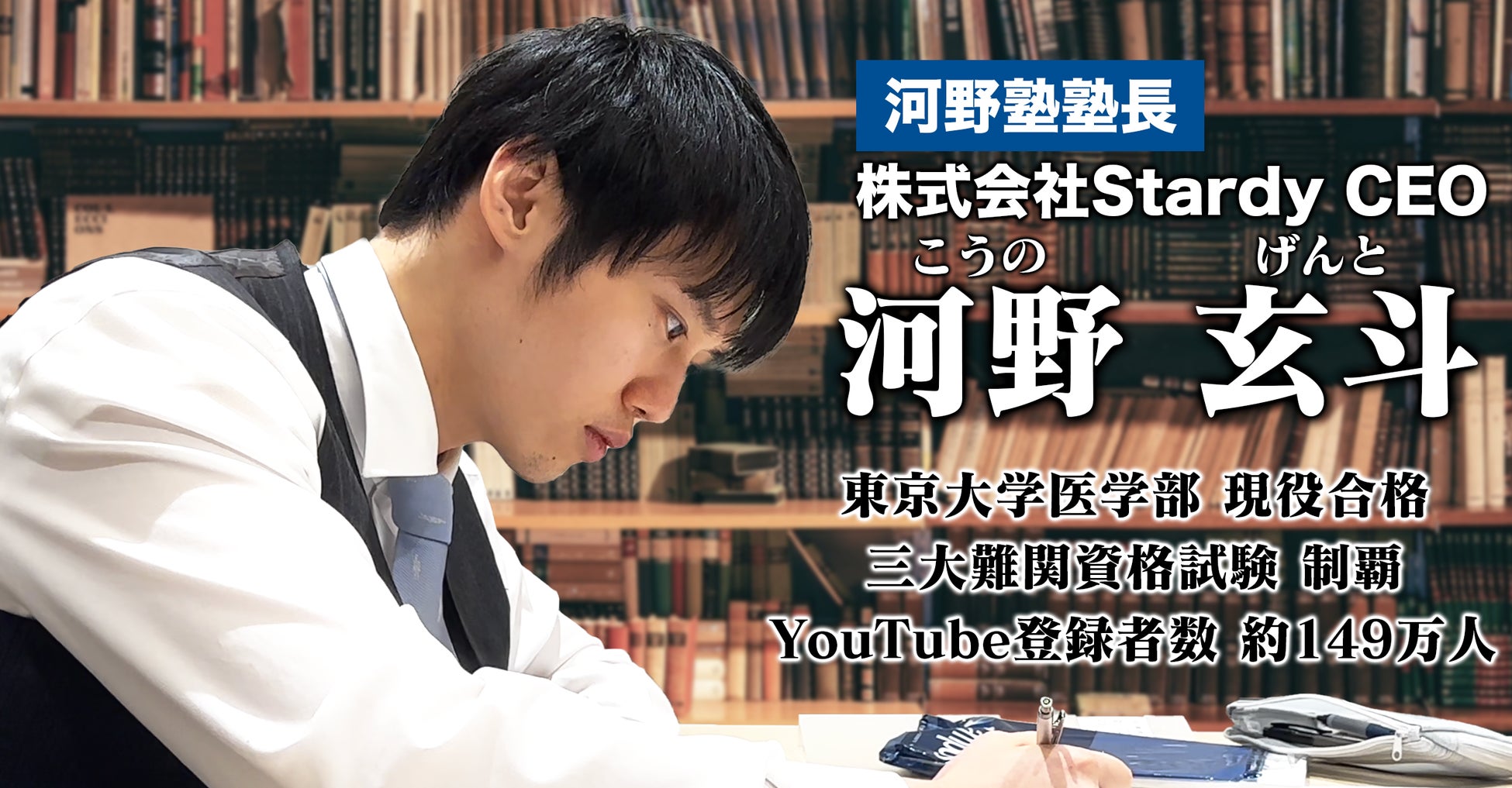 河野は、東京大学理科Ⅲ類医学部に現役合格。在学中に司法試験に合格し、医師国家試験にも合格。2022年、公認会計士に挑戦し11月資格を取得。同年、河野塾を開校。「東大医学部の神脳」と呼ばれた東大医学部在学中から教育系YouTuberとして「Stardy -河野玄斗の神授業」をスタート。タレントとしても各メディアに出演。河野のYouTubeは登録者数149万人(2025年3月現在)を誇り、今も自ら学び挑戦する姿に多くの支持を得ています。