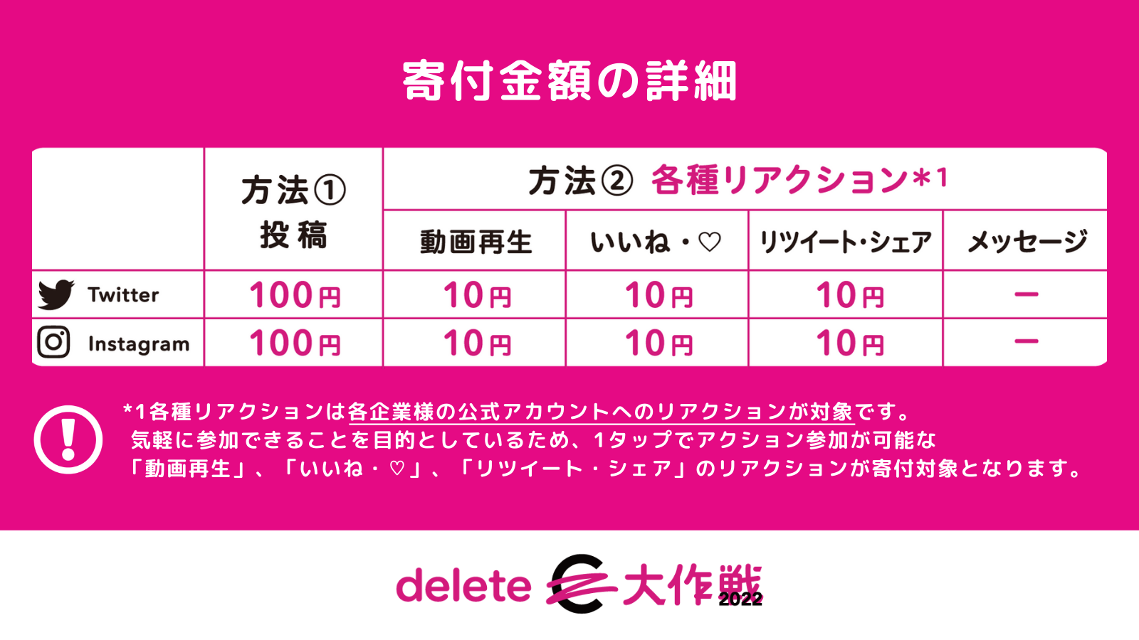 「#deleteC大作戦」に賛同する企業のブランドの商品やロゴに関連する「C」の部分を自由なカタチで消した画像や動画を、「#deleteC大作戦」と「#参加企業名、あるいはブランド名」(※2)をつけて参加者がSNS(Twitter、Instagram)で投稿すると、1投稿あたり100円が、がん治療研究への寄付・啓発費用として参加企業からdeleteCに贈られます。また、参加者が、参加企業の公式アカウントが発信する画像や動画をリツイート/シェア/いいね/再生をすると、1リツイート/1シェア/いいね/1再生/あたり10円が、がん治療研究への寄付・啓発費用として、参加企業からdeleteCに贈られます。