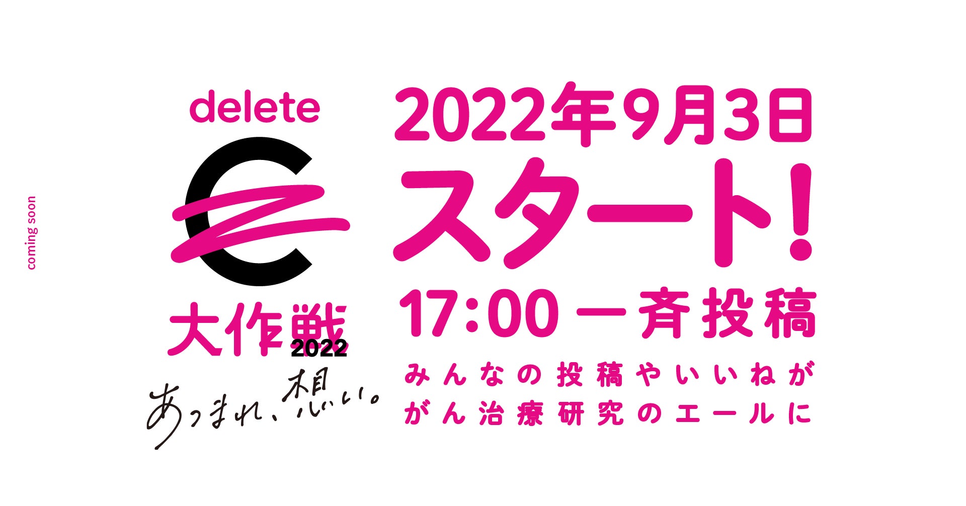 特定非営利活動法人deleteC(デリート・シー/代表理事:小国士朗)は、がん征圧月間中の2022年9月3日(土)~9月30日(金)を、がん治療研究の啓発の強化月間とし、SNSでの投稿や拡散が寄付に繋がる「#deleteC大作戦」を20企業・団体とともに実施します。