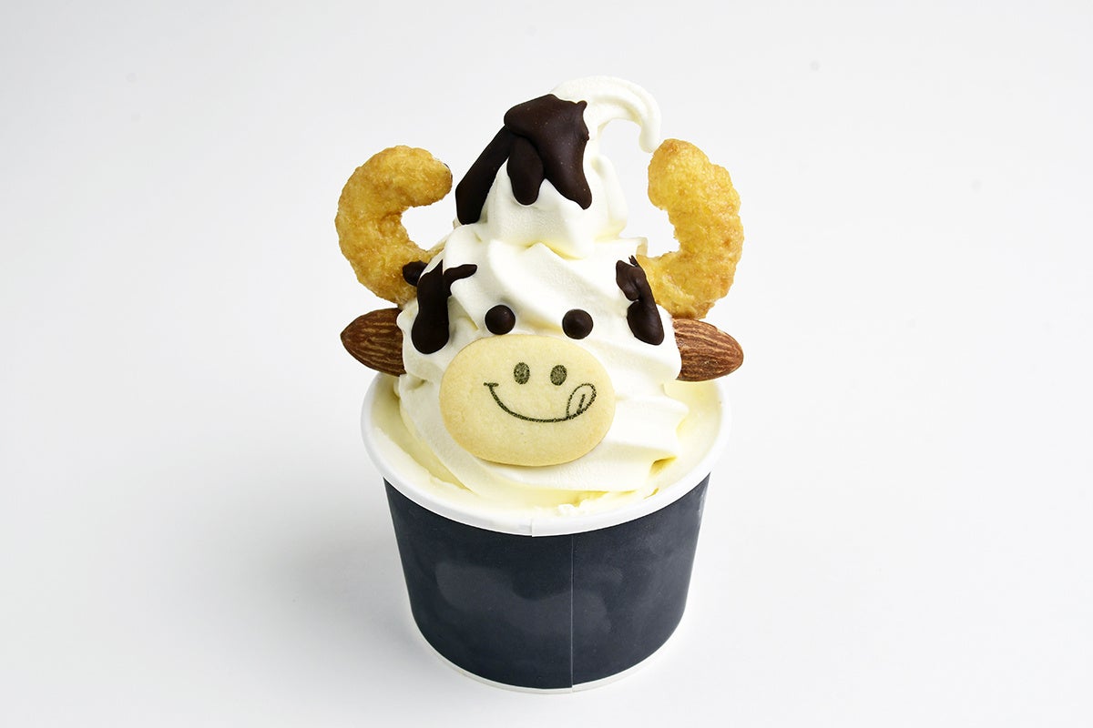 あいぱく人気商品!あいぱくアワード2016最高金賞受賞!2015年のイベントでの発売以来、不動の人気を誇るあいぱくの目玉商品!普段は山梨県以外ではなかなか食べられないソフトクリームです!香ばしいきな粉と濃厚なオリジナル黒蜜をたっぷり使った山梨銘菓の”桔梗信玄餅”とコクのあるソフトクリームが合体!さらに、黒蜜をしみこませたきなこ棒(桔梗信玄棒)をプラス。まるで専門店で食べる“和風パフェ”のようなリッチな味わいが特徴です。その場で自分流にトッピングできる『まきば牧場のウシさんソフト』も新登場!