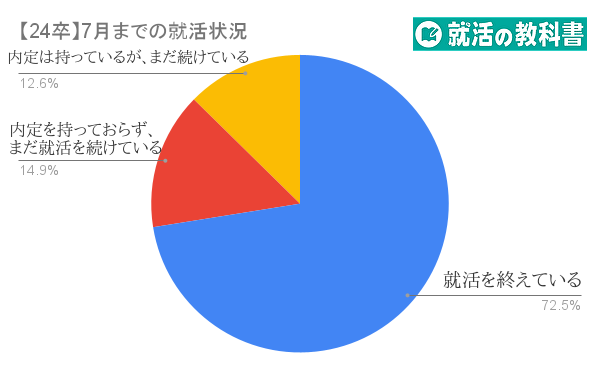 7月までに内定を持っている就活生の割合は85.4%でした。前回のGW前に実施した調査では71%だったので、14%が新たに内定を獲得したことが分かります。いまだに就活を続けている人の割合は27.4%で意外にもまだ多くの人が続けています。