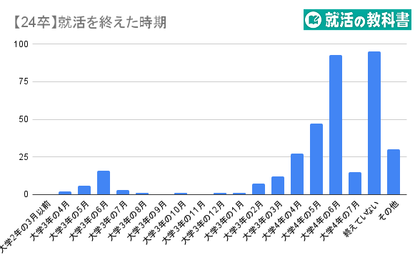 23卒の調査では、就活を終えた時期のピークは大学4年の春(4-6月)なので、昨年と大した違いはない状況になりました。