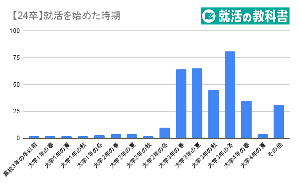 24卒では「大学3年の冬」(22.7%)が最も多いという結果になりました。この調査で70%の学生が大学3年生時に就活を始めていることが分かります。