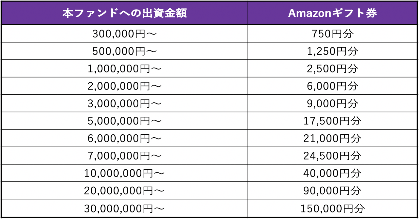 バンカーズにとって上期最後の募集ファンドとなる本ファンドでは、投資家のみなさまへの感謝を込めて、「上期最後の募集ファンド!下期もよろしくお願いしますキャンペーン」を実施いたします。本ファンドやキャンペーンの詳細に関しては、下記ページよりご確認ください。