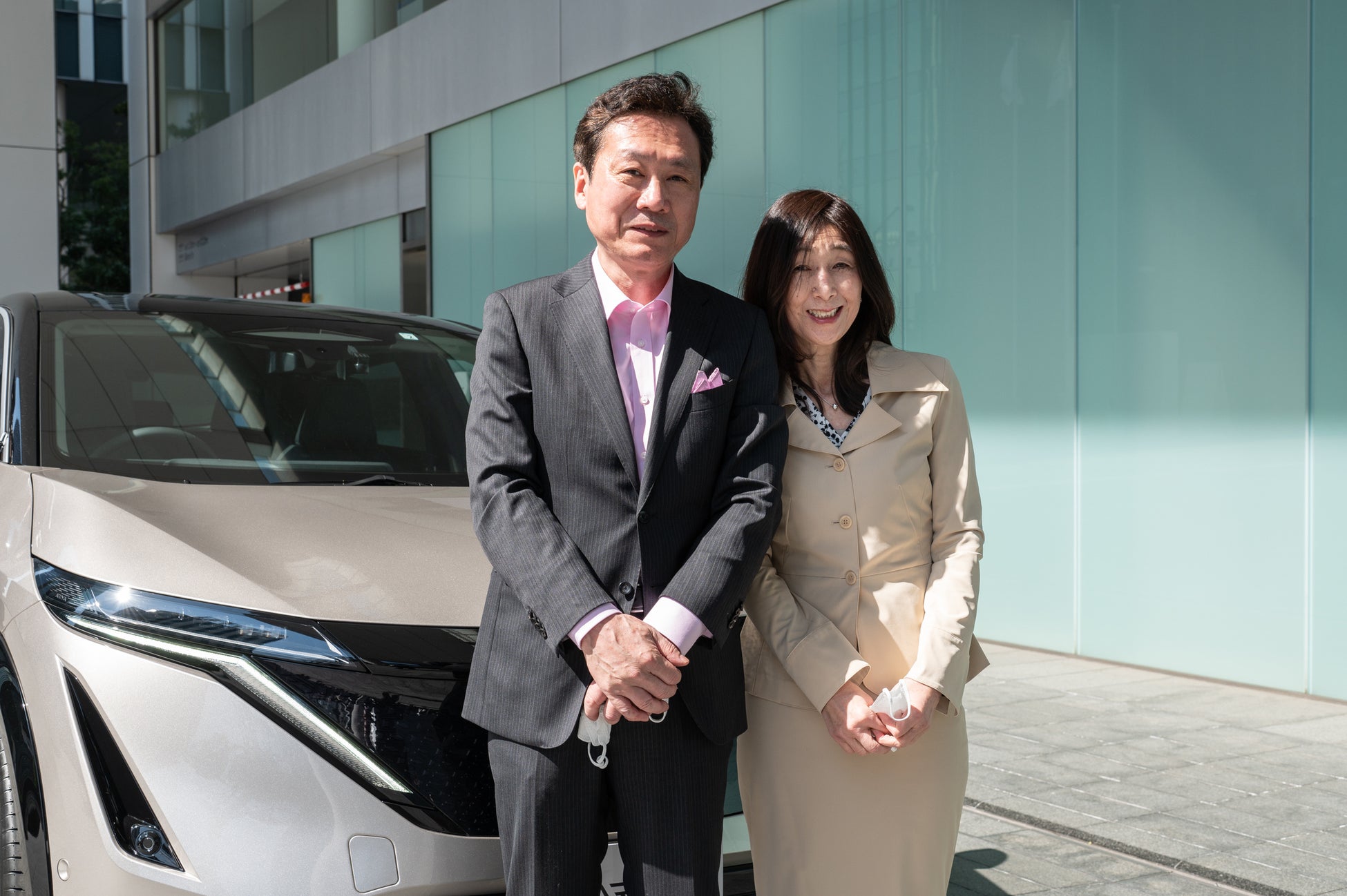 「日産アリア」第1号車のオーナーとなられた中村さまは、納車セレモニーにご夫婦でご参加くださいました。元々、車に興味がなかったという中村さま。災害時の給電設備として蓄電池を探していた際に電気自動車から給電できることを知り、アリアに興味を持たれたそうです。そして、「エクステリアの美しさ、インテリアのディスプレイが圧倒的な存在感を出しているデザインが大好きです」と語ってくださいました。第一号車のオーナーになったことについては、「誰よりも早く1番でこの車欲しいよね、と妻ともよく話をしていたのですが、それが本当に現実のものとなってしまい、ちょっとびっくりしています」と驚きを隠せないご様子でした。また最初のドライブについては、「今週末は早速アリアで軽井沢に出かけます」、と楽しみにされているご様子でした。