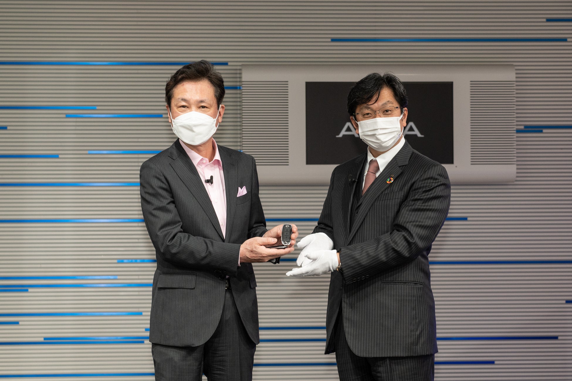 セレモニー冒頭にて、祝福の挨拶をした日産自動車 常務執行役員の伊藤は、オーナーの中村さまにご購入への感謝を述べると共に「新たなフラッグシップである日産アリアをお客さまにお届けできたことを本当にうれしく思っています。また本日、この日産アリアが中村さまの運転で公道を走り出すことに気持ちが昂っています」と高揚感を表しました。そして、アリアについては、「日本らしい力強い美しさを表現したデザイン、ラウンジのような心地よい空間の室内、EVならではの静粛性はもちろんのこと、力強さも兼ね備えた新次元の“プレミアムな走り”。プロパイロット 2.0、プロパイロット リモート パーキングなど、日産アリアの多彩な先進運転支援技術、最先端のテクノロジーが、ドライバーに未体験のワクワクを届けます」と、その魅力を語りました。
