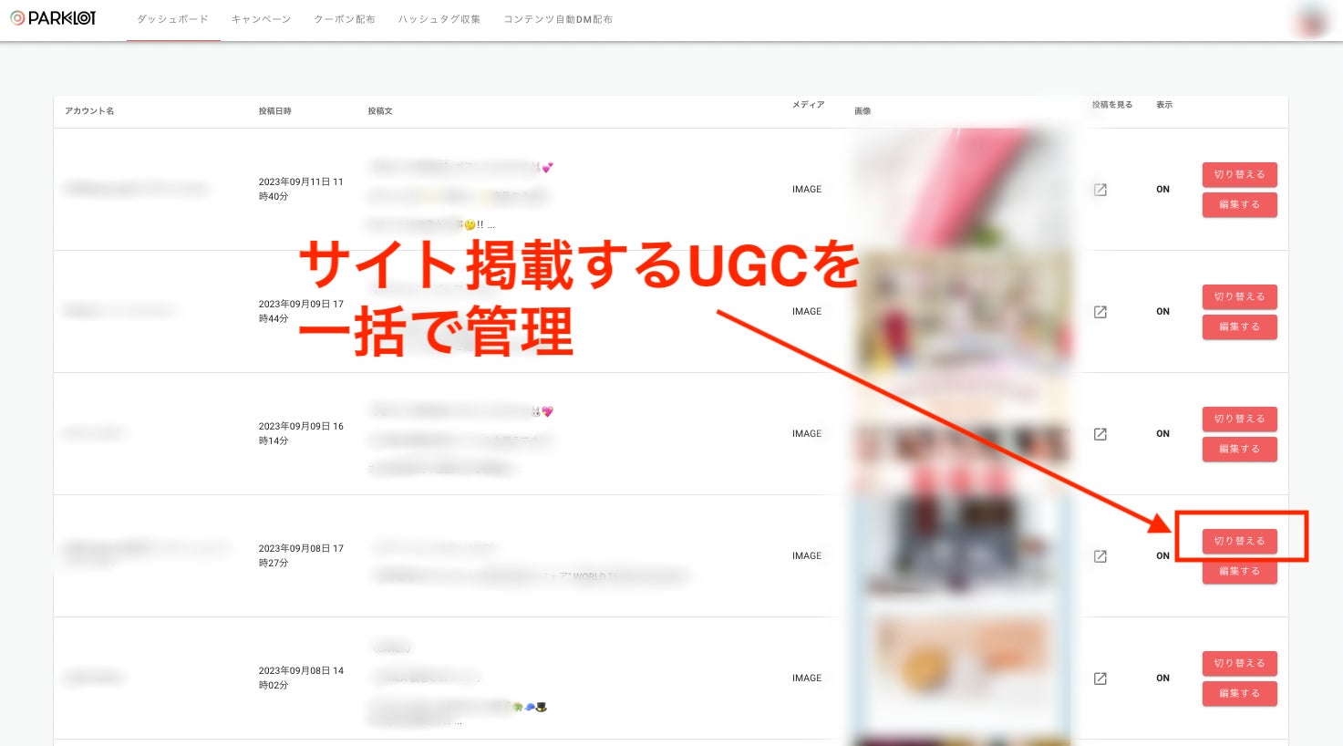 ・サイトに表示する投稿を選び、「表示ON」に切り替える