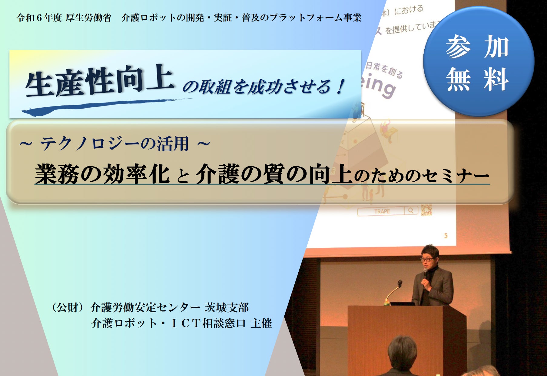 2024年7月9日(火)、令和6年度介護ロボット等の開発・実証・普及広報のプラットフォーム事業相談窓口である公益財団法人介護労働安定センター茨城支部主催、第1回研修会「〜テクノロジーの活用〜業務の効率化と介護の質の向上のためのセミナー」に代表鎌田が講師として登壇いたします。