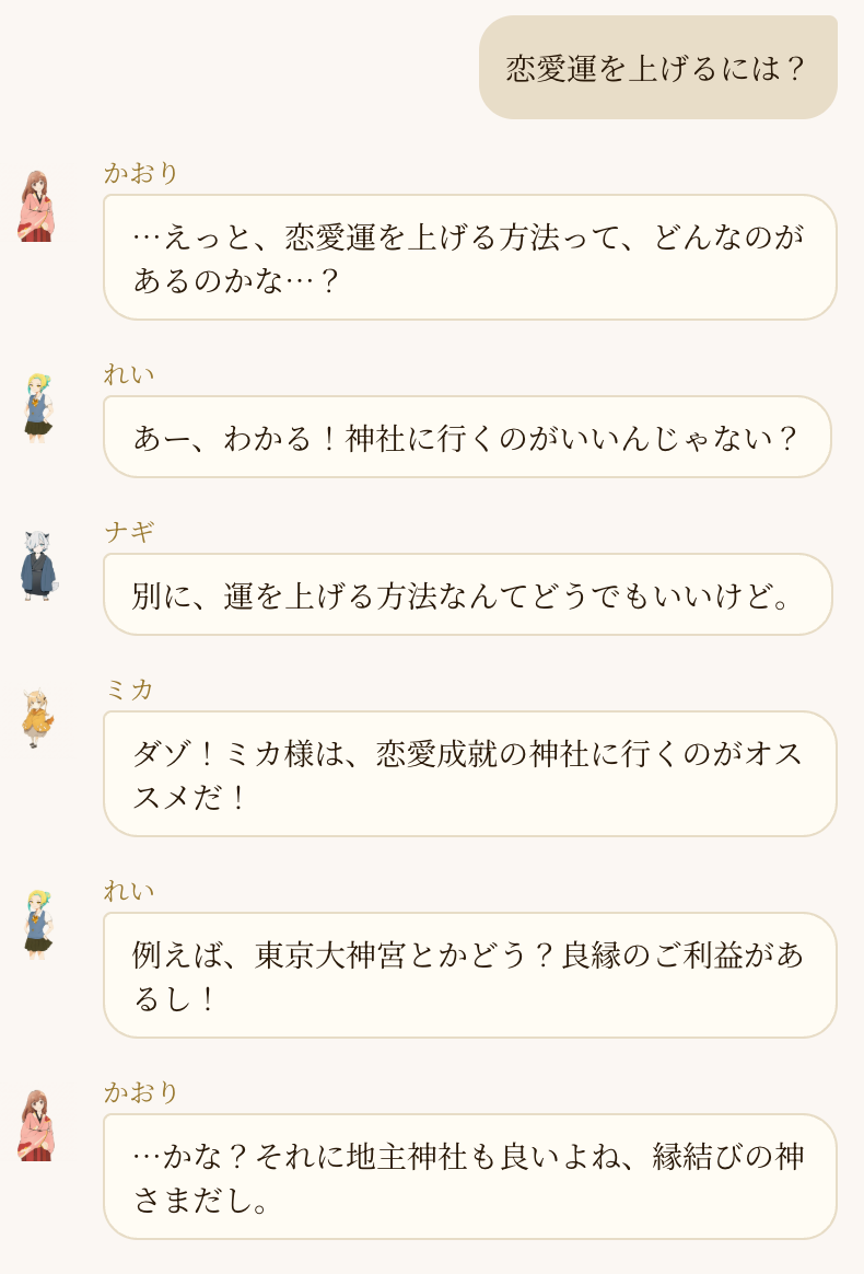 キャラクターと対話する中で、悩みに即した神社仏閣を探すことができる。