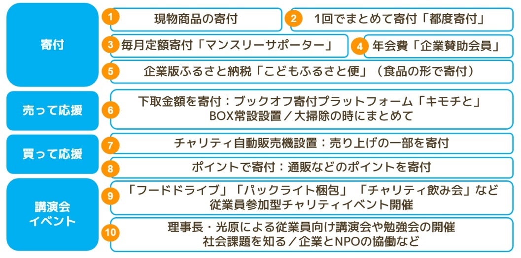 ~都度やマンスリーでの寄付のほか、社員のボランティア活動や講演会開催、企業版ふるさと納税など法人向け支援方法は10種類に~