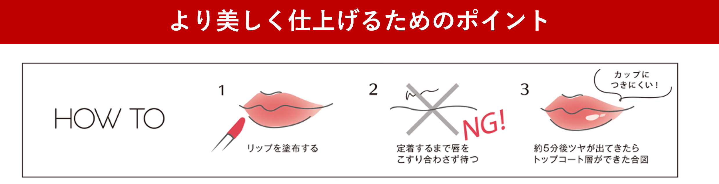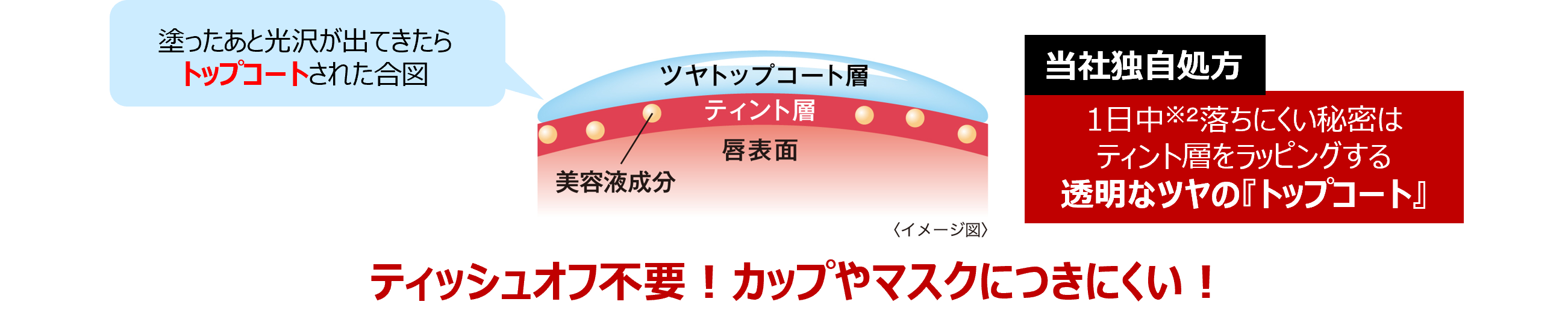 リップを塗布して約5分後※8 、ツヤが出てきたらトップコート層ができた合図です。