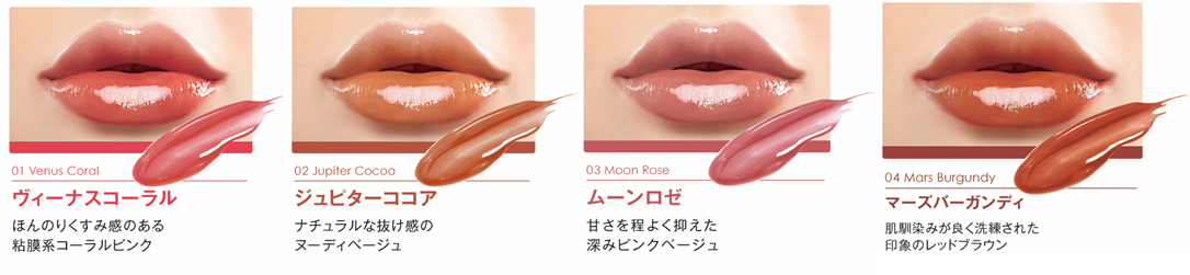ガラスのようなツヤ仕上がり、高発色、使うたびにうるおう唇へ。