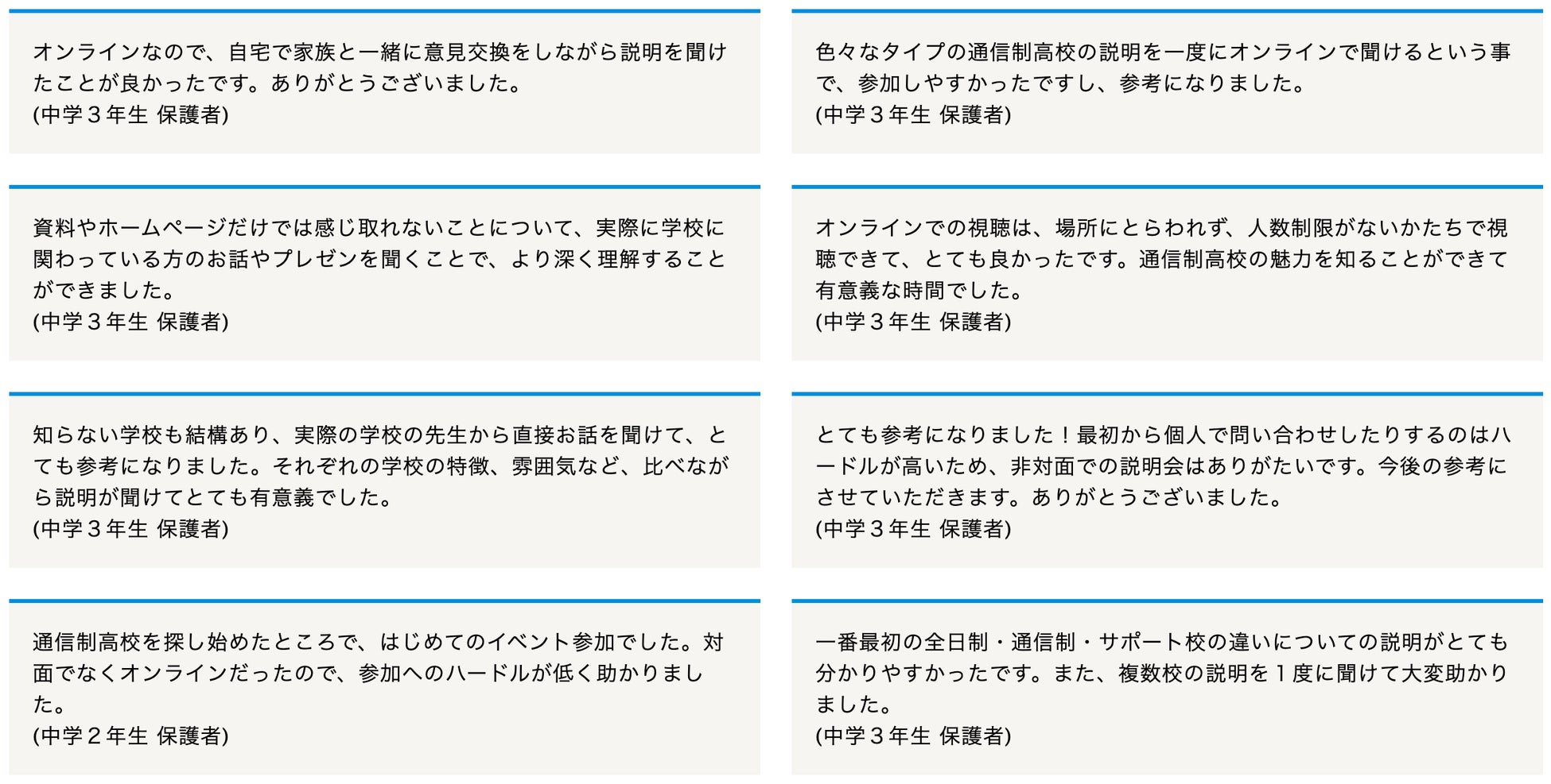 〇 登壇スクール 湘南一ツ星高等学院、HR高等学院、ヒューマンキャンパスのぞみ高等学校 川崎学習センター、ベネッセの通信制サポート校 Be高等学院、N高等学校/S高等学校/R高等学校(2025年4月開校準備中)、ワオ高等学校、学研WILL学園、トライ式高等学院(登壇順)