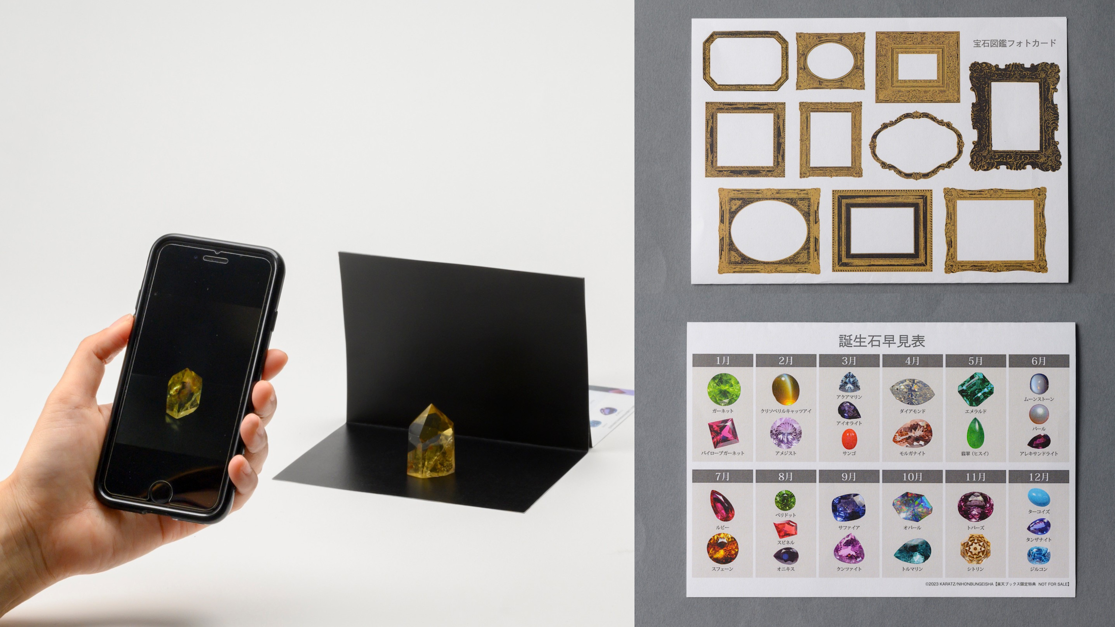 好きな宝石や小物の図鑑風写真を撮ることが出来るカードで、二つ折りの片方が黒背景で立体的な写真が撮れるブラックパターン、もう片方は小さな宝石や小物などを撮影したい時の俯瞰写真に便利なミニフレーム仕様になっています。最新の誕生石がわかる早見表もついています。