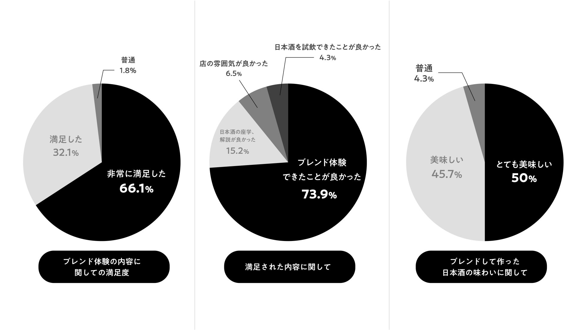 11月20日から始めたプレオープンの体験者からは、多くのご感想をいただいています。参加者によるアンケート結果によれば、「非常に満足した」「満足した」が98.2%!具体的には「ブレンド体験できたことが良かった」が73.9%、「日本酒の学び、説明が良かった」が15.2%など、まだまだ浸透していない日本酒のブレンドですが好印象の結果になりました。また、ご自分でブレンドした日本酒に対して、「とても美味しい」が50%、「美味しい」45.7%と美味しくなることを実感いただいた様子でした。(※アンケート結果は、2025年1月現在56名を対象としています)