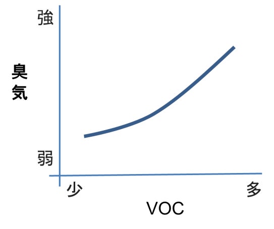 VOC (Volatile Organic Compounds/揮発性有機化合物)は約200種類の物質があり、厚生労働省ではそのうち13物質に関する室内濃度の指針値と、複数のVOCの混合物の濃度レベルであるT-VOCの室内濃度の暫定目標値を示しています。