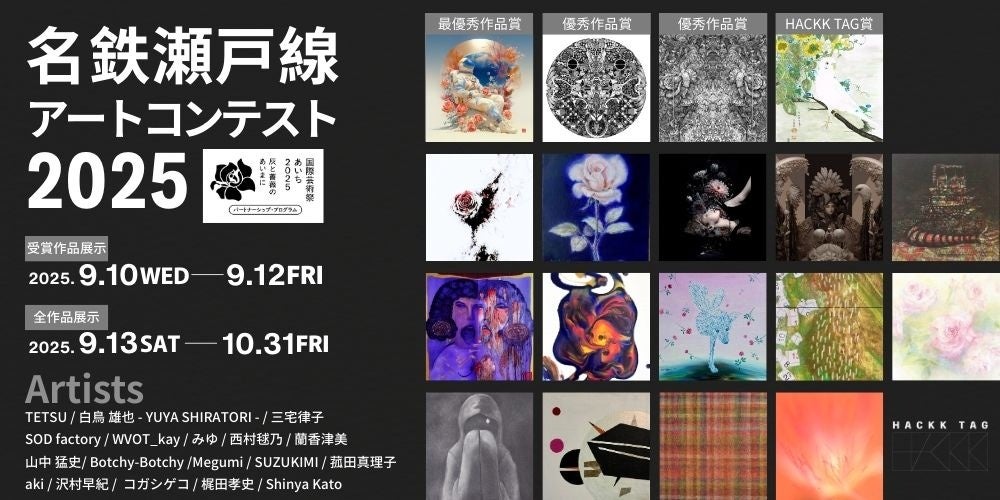 この度、名古屋鉄道株式会社が運営する「MEITETSU ART GALLERY」において、名鉄瀬戸線沿線地域を舞台に開催される国際芸術祭「あいち2025」にちなんで、名鉄瀬戸線アートコンテストを開催し、入選したアート作品を展示します(HACKK TAGを運営する株式会社IDEABLE WORKSは名古屋鉄道株式会社とともに国際芸術祭「あいち2025」のパートナーシップ・プログラムに選定されております)。