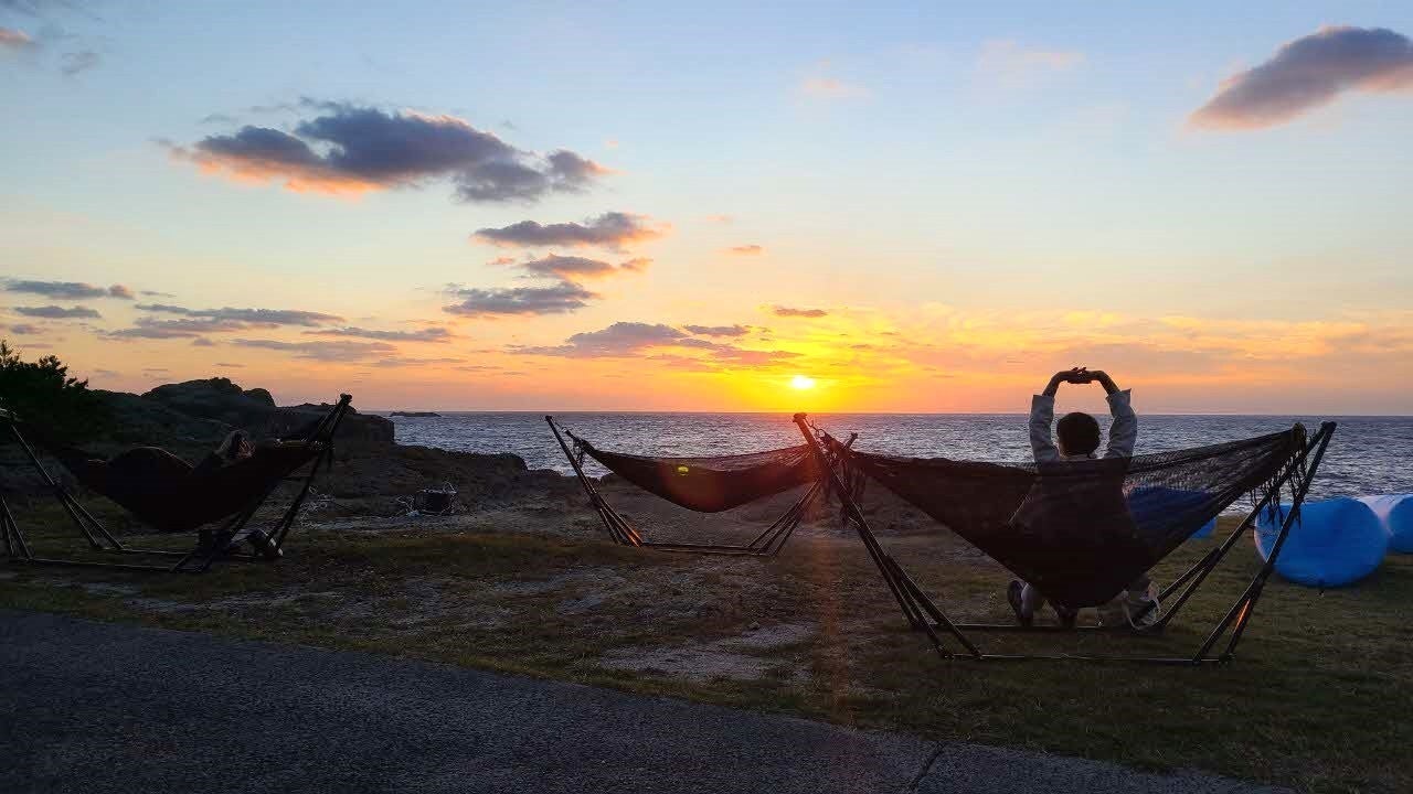 島根半島の最西端、日御碕。「日が沈む聖地」に認定されているとおり、美しい夕日=サンセットを楽しむことができるエリアです。このプランでは、出雲日御碕灯台のすぐ近く、日本海に沈みゆく夕日を崖上から楽しむことができる特等席にデッキチェアとお酒、おつまみをご用意してお待ちしております。