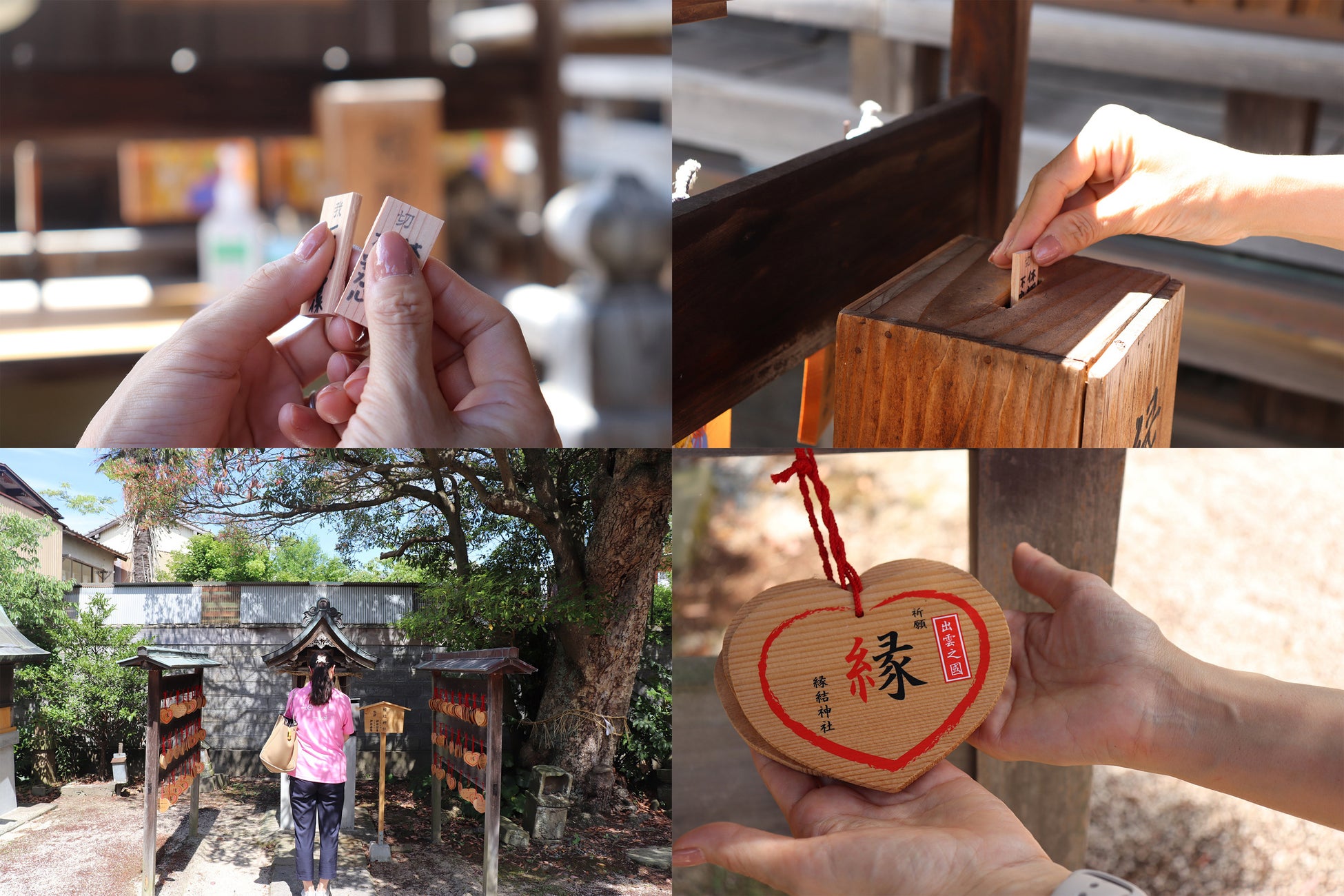 主祭神は、霊剣の神である「布都御魂神(ふつのみたまのかみ)」。「ふつ」は剣で物を断ち切る音を表しているとされ、悪縁消除のご利益があると言われています。まず拝殿にある縁切り祈願の木札に切りたい縁を記入します。それを神前にお供えしてから縁切り箱に入れます。こうして悪縁を切ってからあらためて縁結び祈願することで、良縁が結びやすくなるとも言われ、出雲大社で縁結び祈願を行う前に立ち寄る方が増えています。境内には小さな一式飾りがたくさんあり、いくつあるか探してみるのもひとつの楽しみです。
