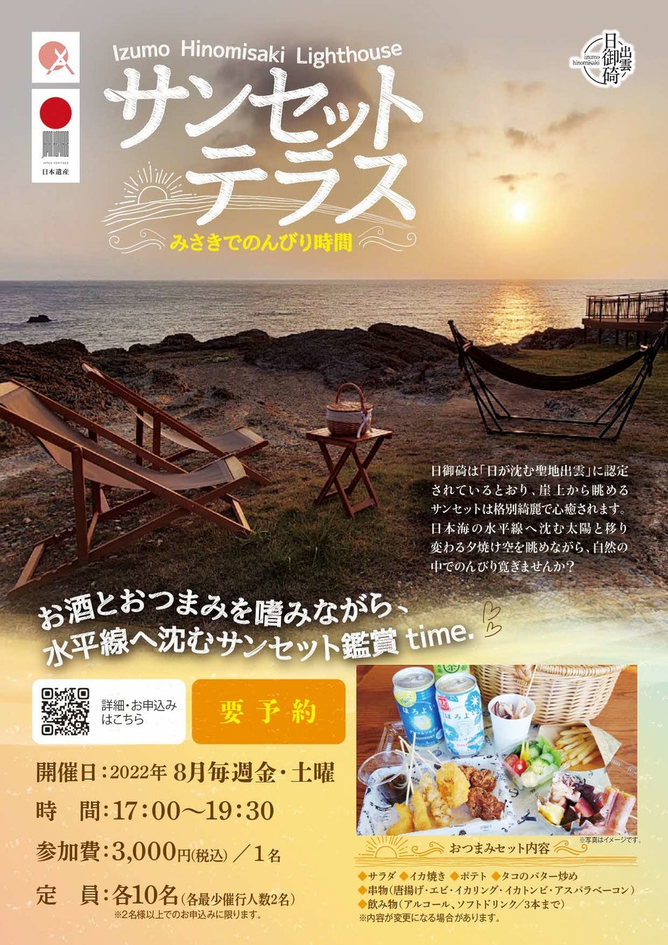 一般社団法人 出雲観光協会(会長:田邊達也、以下 出雲観光協会)が主催する「サンセットテラス みさきでのんびり時間」が令和4年8月からスタートします。