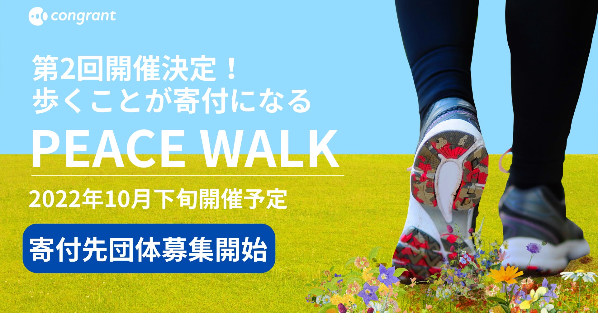 NPO・非営利団体向け寄付決済システム「congrant(コングラント)」を提供するコングラント株式会社(本社:大阪市西区、代表取締役:佐藤正隆)は、日本寄付財団を寄付パートナーに迎え、第2回目のオンライン参加型チャリティウォークイベント「PEACE WALK」を実施します。