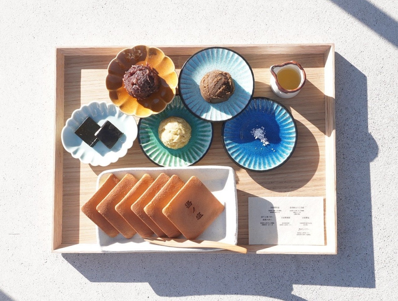 プレートには、店内で一から作りあげる3種の自家製餡、味わいの異なる3種の自家製バター、そして皆生の海水を時間をかけて炊き上げてつくる自家製塩をご用意。餡・バター・塩の組み合わせは20通り以上に広がり、甘味・塩味のバランスを“自分の手で選ぶ”楽しさを感じられます。