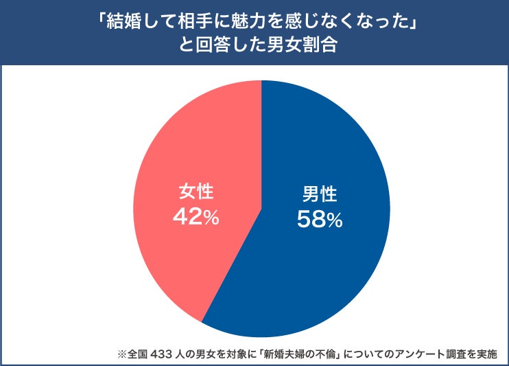 結婚して相手に魅力を感じなくなったからと答えた方は、男性58%、女性42%でした。