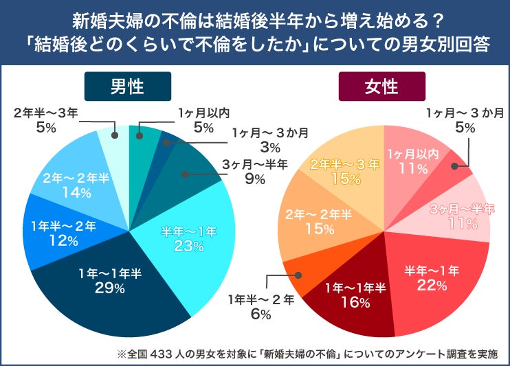 新婚期間中に不倫をした経験のある男女433人に、結婚後どのくらいで不倫をしたか調査したところ、男女ともに半年から増え始めることが分かりました。