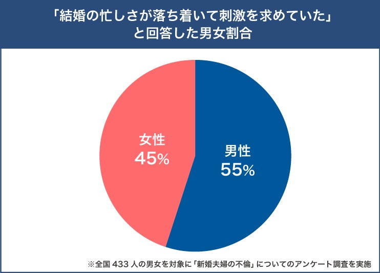 結婚の忙しさが落ち着き、刺激を求めて不倫したという方は男性55%、女性45%でした。