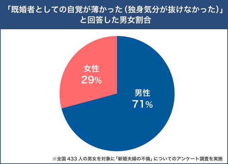 不倫した理由として「既婚者としての自覚が薄かった」と答えたのは男性が71%、女性は29%でした。