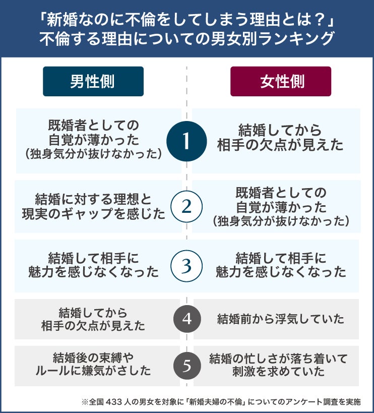 新婚であるにも関わらず、不倫してしまう理由として、男女合計で最も多く挙げられたのは「既婚者としての自覚が薄かった」というものです。