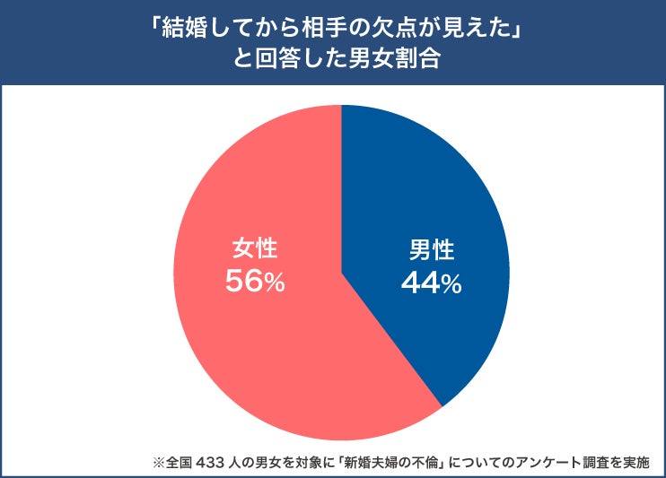 結婚してから相手の欠点が見え不倫してしまったと答えた男性は44%、女性は56%と女性の方が多い傾向にありました。