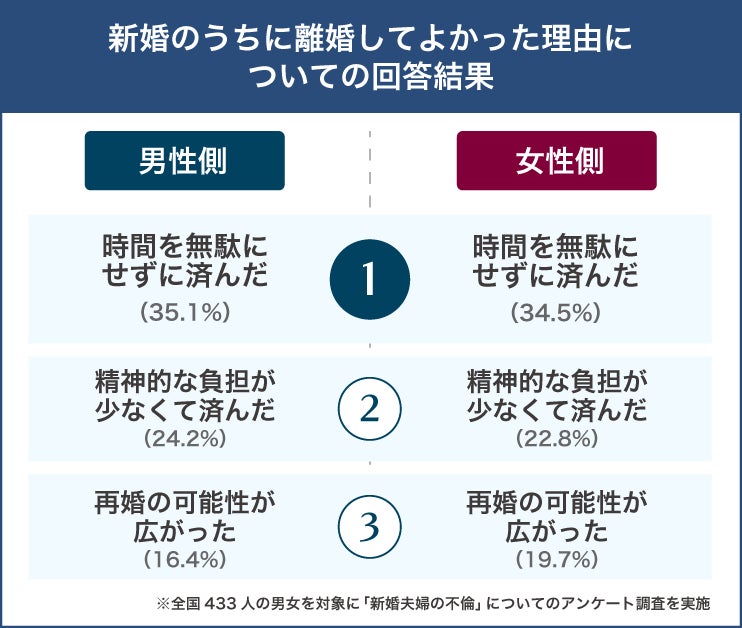 アンケートの結果、新婚のうちに離婚したことで「時間を無駄にしなくて済んだ」と感じている方が、男性で35%、女性で34%ほどいました。