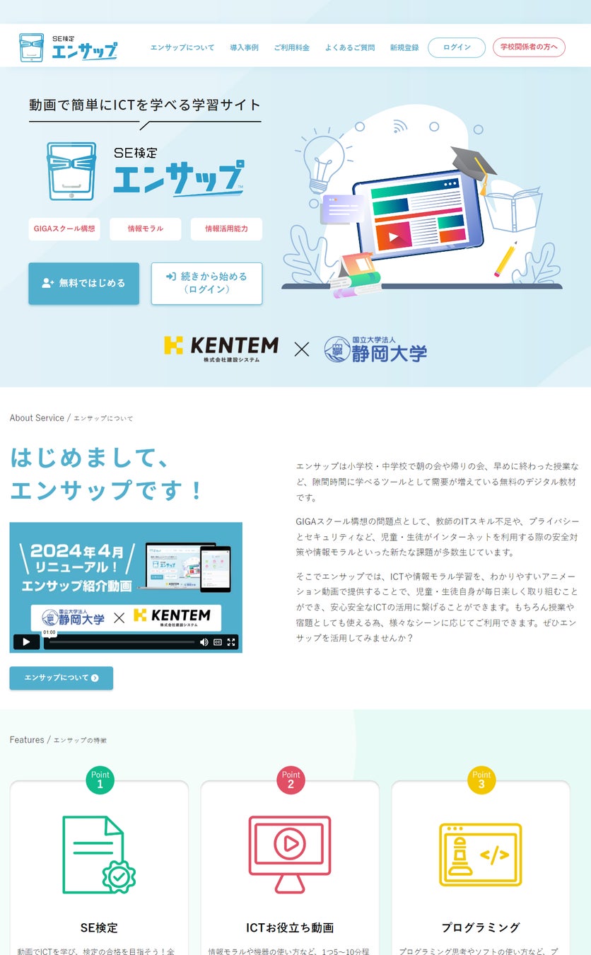 KENTEM(株式会社建設システム)(本社:静岡県富士市、代表取締役:重森 渉)は、静岡大学 教育学部 塩田真吾准教授(専門:教育工学・授業デザイン)と共同研究で提供している、情報モラルやICTが学べるデジタル教材「エンサップ」のサービスサイトをリニューアルいたしました。