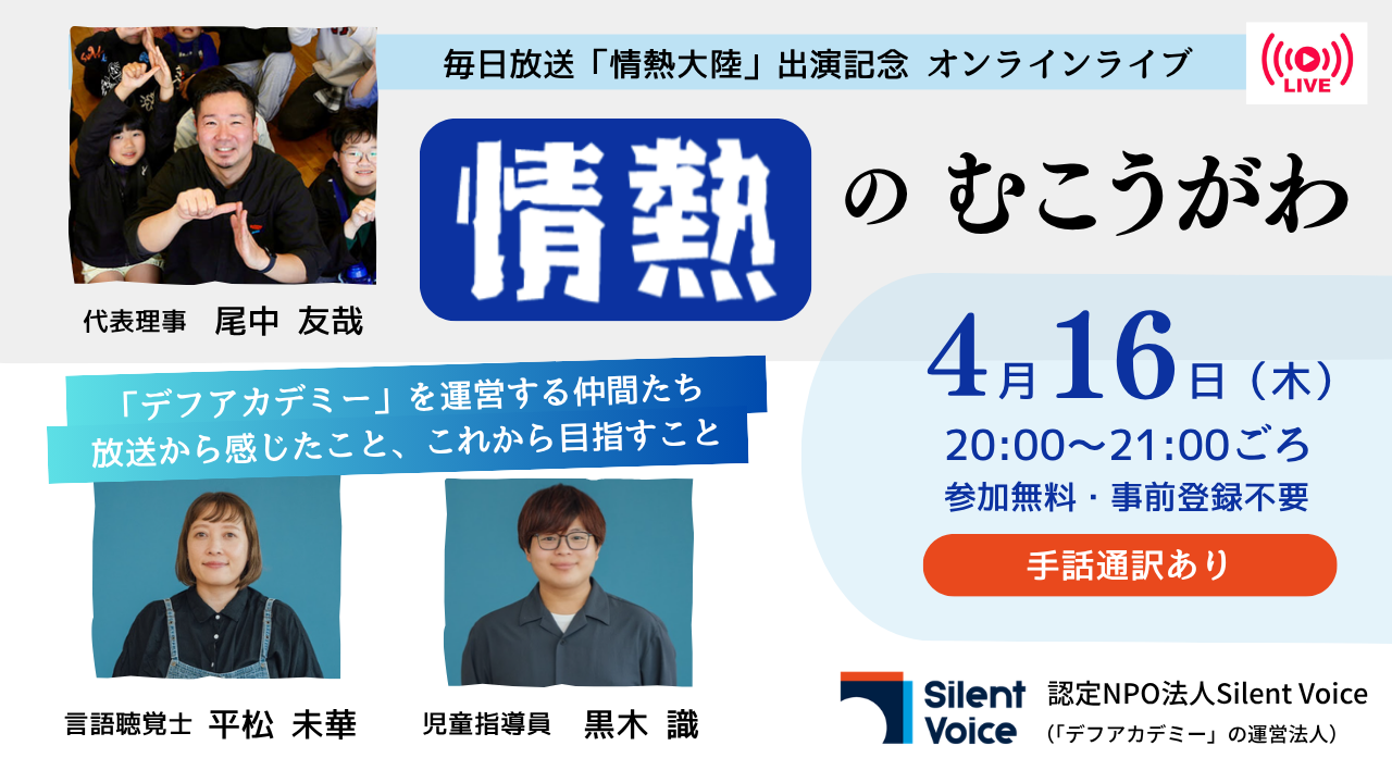 認定NPO法人Silent Voice(大阪市中央区、代表理事:尾中友哉)は、2026年4月16日(木)20:00より、聞こえない・聞こえにくい子どもたちの教育環境と支援の課題を語るオンラインイベント「情熱のむこうがわ」をYouTube Liveにて開催します。参加無料・事前登録不要・手話通訳付きで、どなたでもご視聴いただけます。