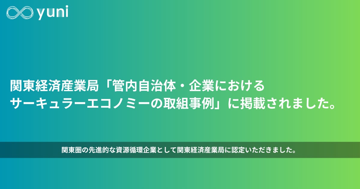 株式会社yuni(本社:東京都渋谷区、代表取締役CEO:内橋 堅志、以下「yuni」)は、経済産業省 関東経済産業局が作成した「管内自治体・企業におけるサーキュラーエコノミーの取組事例集」に掲載されたことをお知らせいたします。