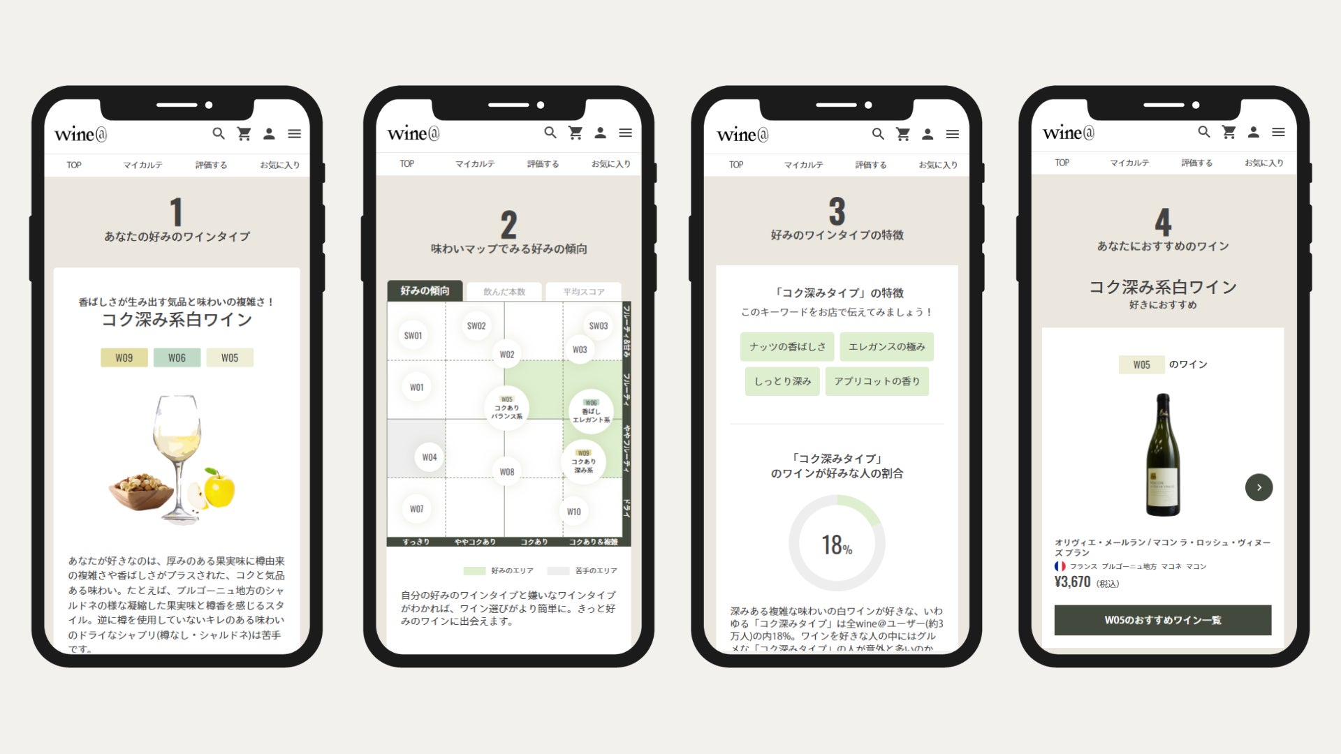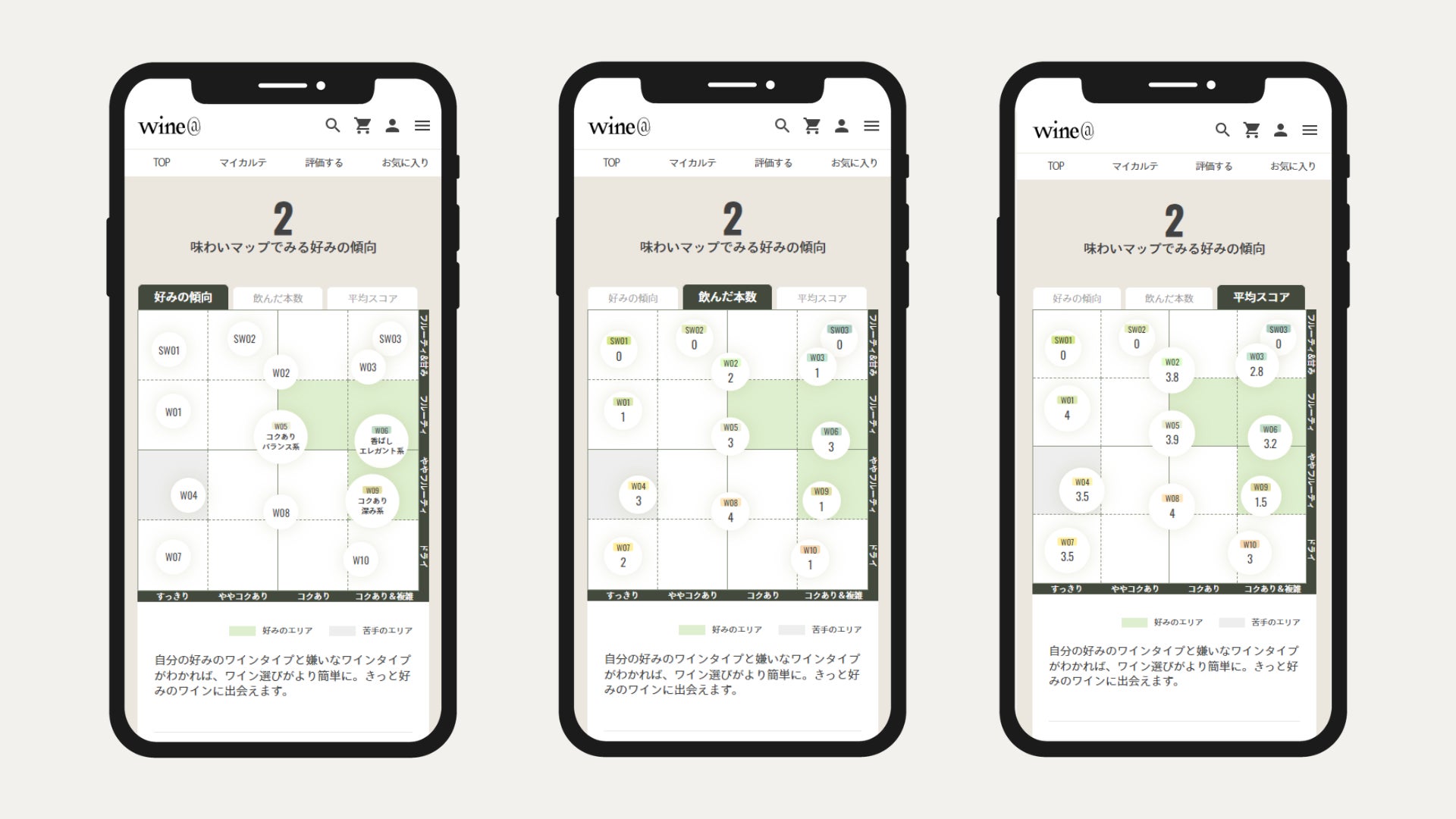 オンラインでワインを選ぶとき、お店でワインを購入するとき、飲んだワインを評価するとき…ワインに触れる時にいつでも好みをすぐに確認できるよう、カルテの情報をわかりやすく整理、充実させました。また、3種類のワインを飲んで評価するだけでカルテが作成されるようになり、もっと手軽に自分の好みを知ることができるようになりました。