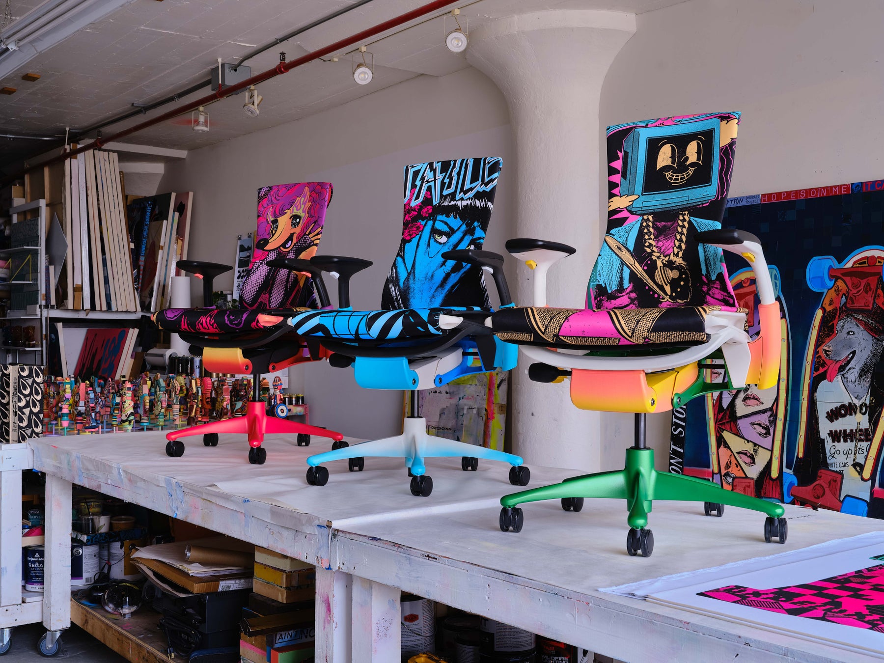 FAILE は、Herman Miller の「Embody Gaming Chair」をキャンバスに見立て、独自の解釈を加えたドローイングを描き、このコラボレーションを象徴する、世界にひとつずつしかない限定チェアを12脚制作しました。Herman Miller Gaming のアイコニックなゲーミングチェアであるEmbody Gaming Chairが、FAILE により更なる喜びや楽しさが加わった、大胆で鮮やかなアートピースに生まれ変わりました。このチェアは販売されず、未来のデザイナーたちのインスピレーションの源として、Herman Miller Gaming のアーカイブに収蔵されます。