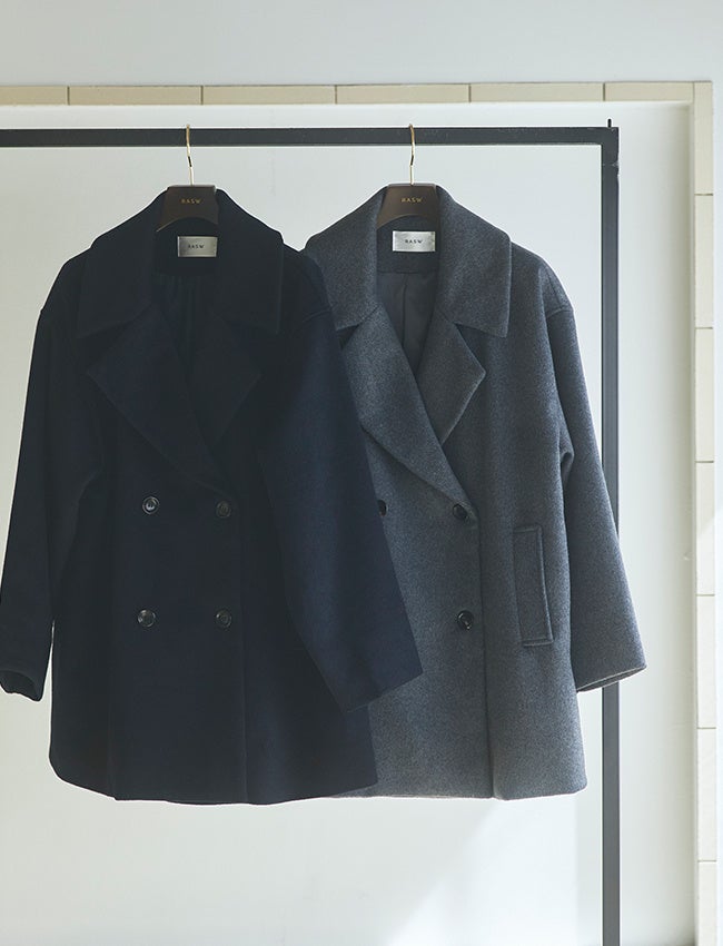 ボクシーなシルエットがモードな雰囲気に見せてくれるピーコート。