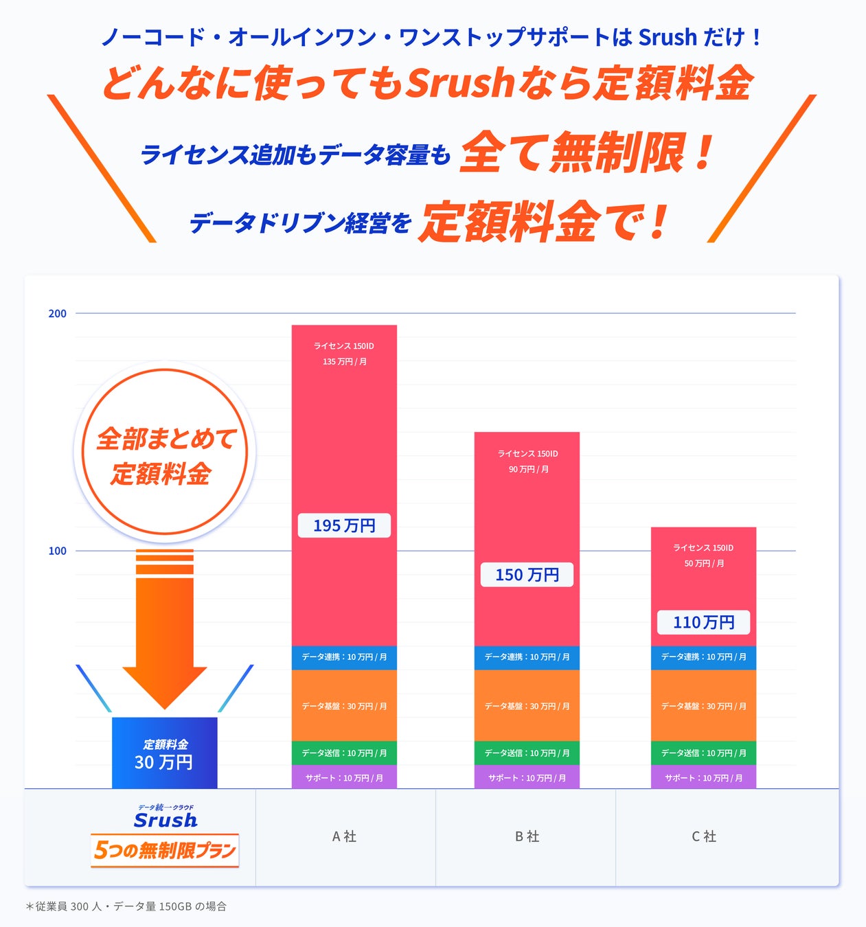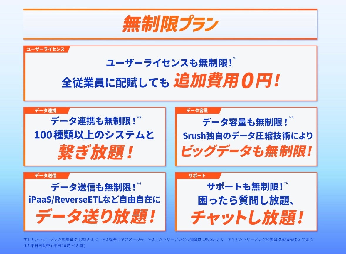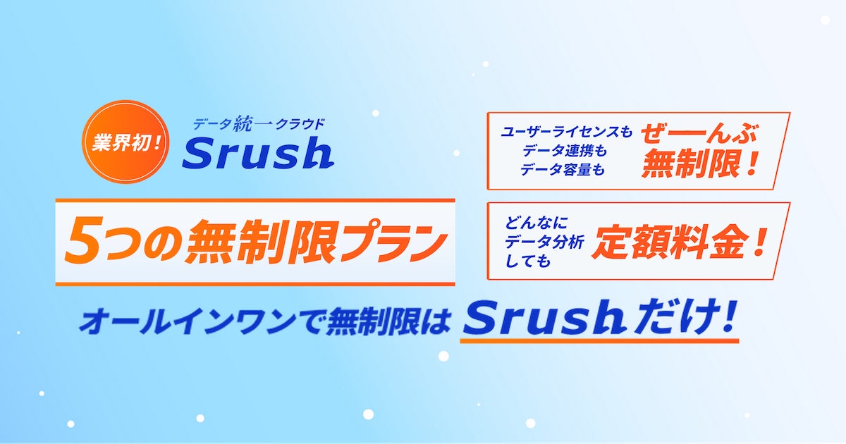 ≪日本初・データ分析が無制限!※≫ データ統一クラウドSrushは【ライセンス数・データ連携数・データ容量・データ送信数・チャットサポート】の5つが無制限となる新プランを開始!