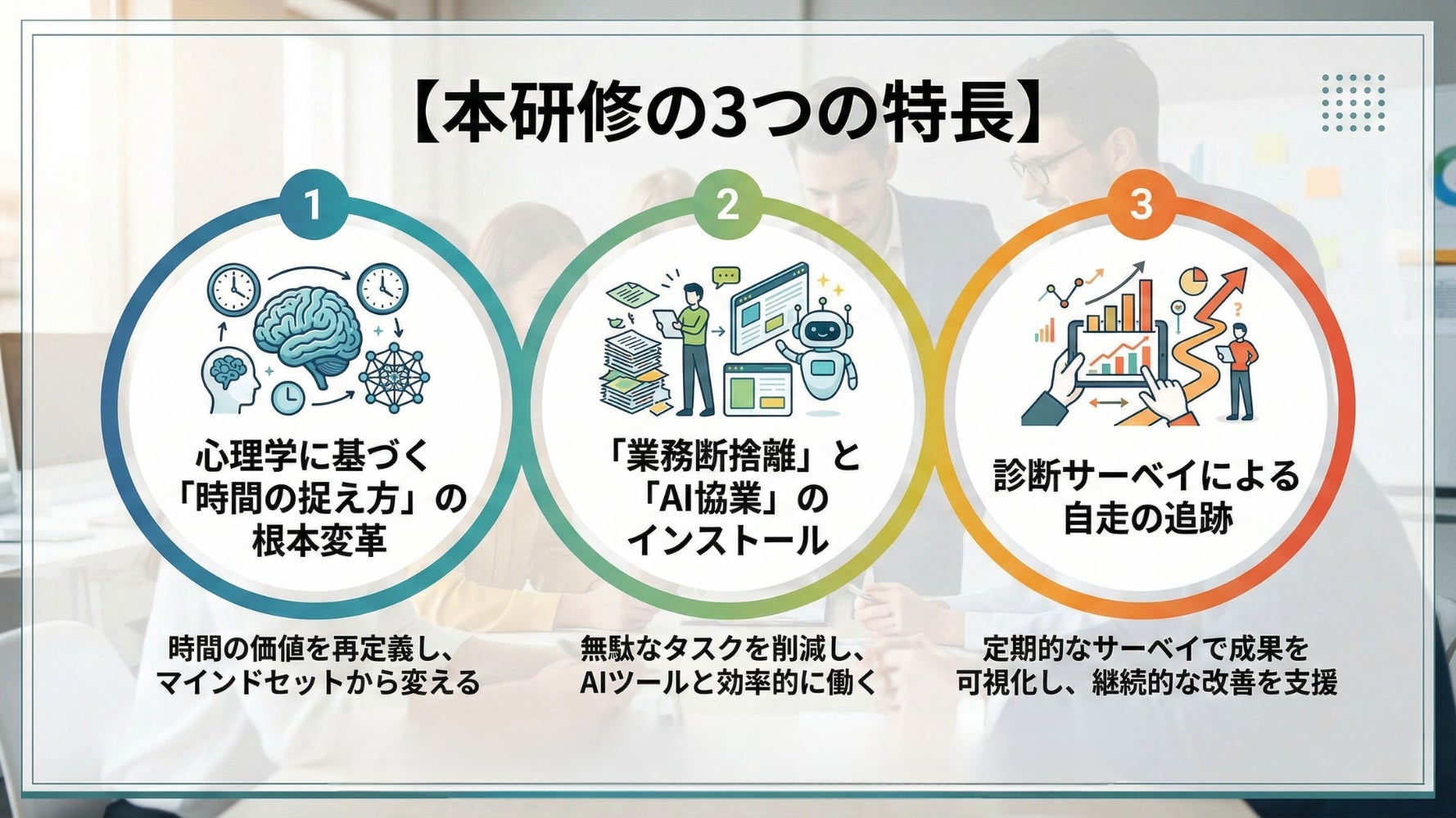 この度、提供を開始する『時間革命マネジメント研修』は、『時間心理経営™』のエッセンスを2時間に凝縮した、管理職向けの集中プログラムです。