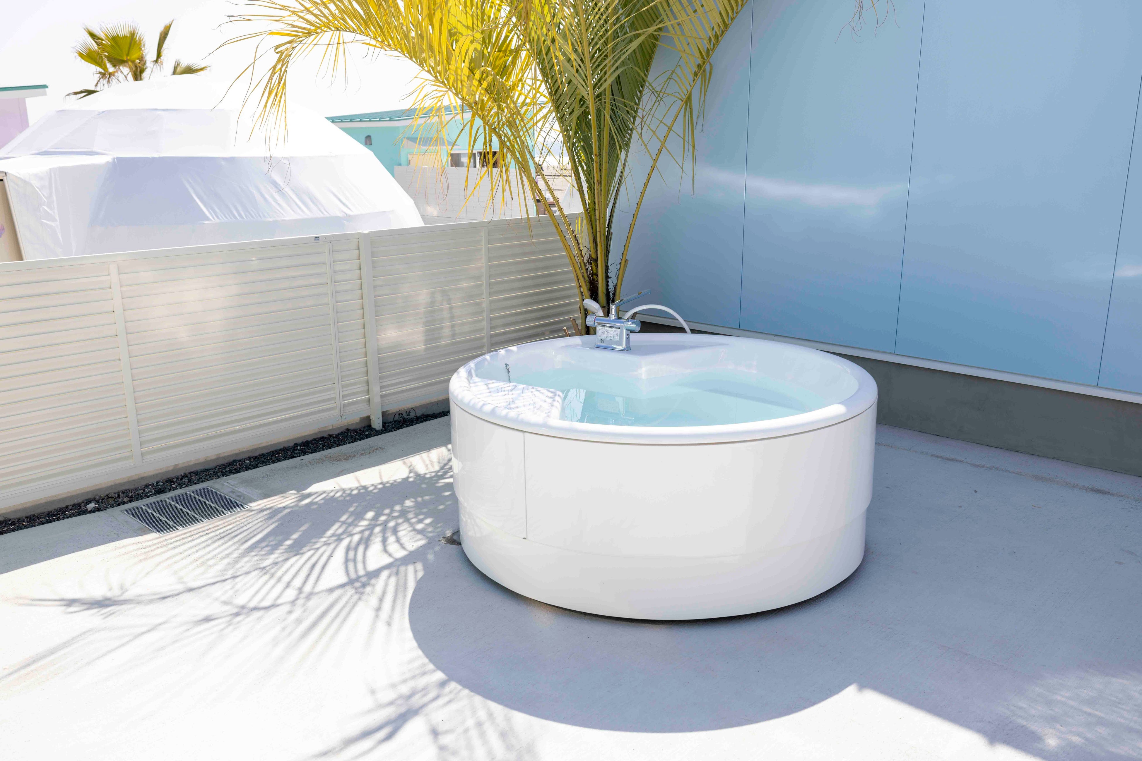 「波音をBGMに、星降る夜のゆったりバスタイム」プライベートバス付ドームテントでは、海や星を眺めながらオープンエアのジャグジーに浸かる贅沢な体験ができます。※水着の着用必須です。
