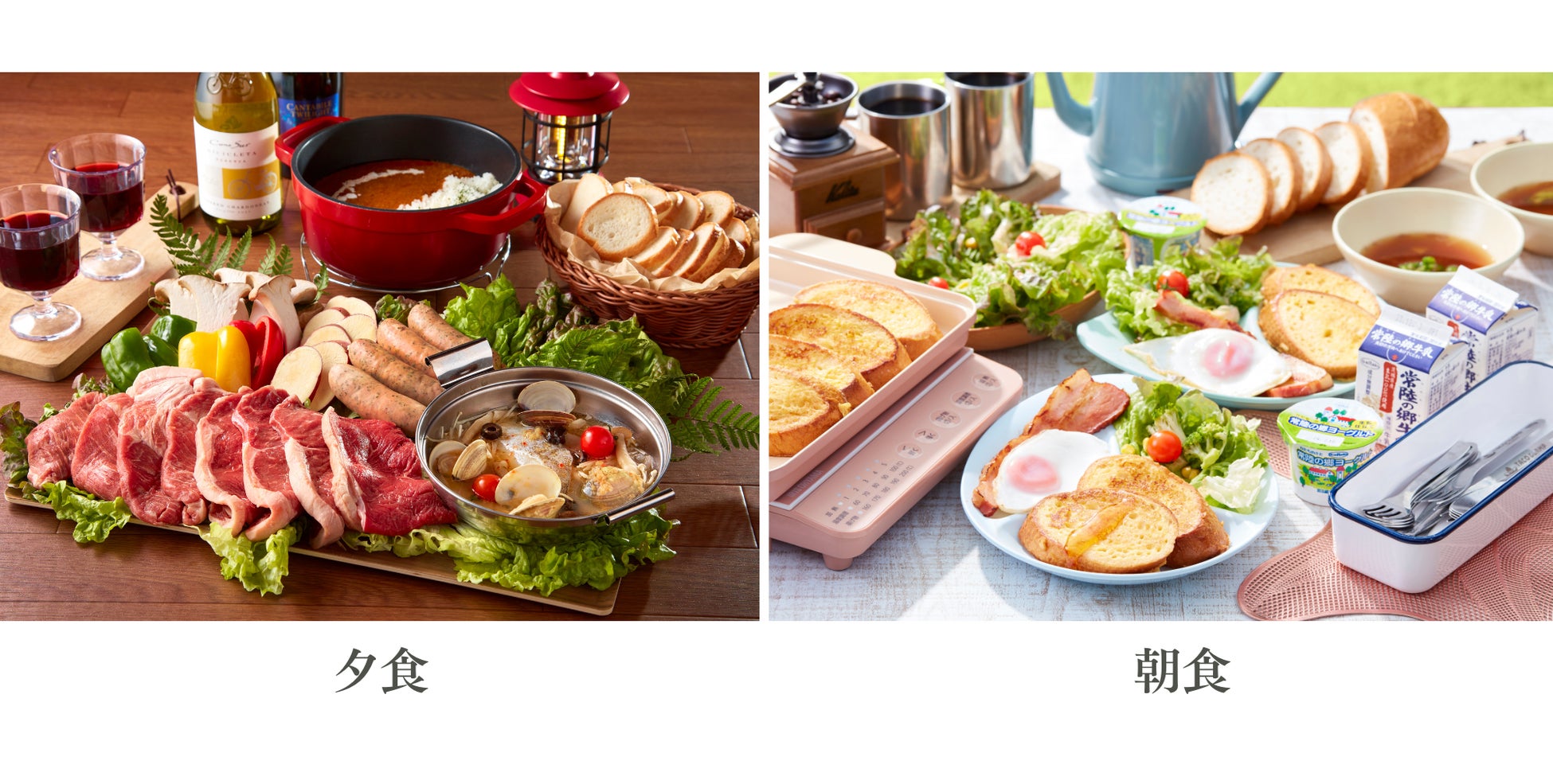 お食事は各宿泊テントに隣接したBBQハウスで楽しむことができます。本格ガスグリルはBBQの本場アメリカで広く普及しているWEBERを導入しています。夕食は「茨城県産コシヒカリ」を使用したキーマカレーのメニュー、朝食は「東京ラスクのフランスパン」を使用したフレンチトーストに、茨城産の牛乳やヨーグルトで、贅沢な癒しのひと時を楽しめます。