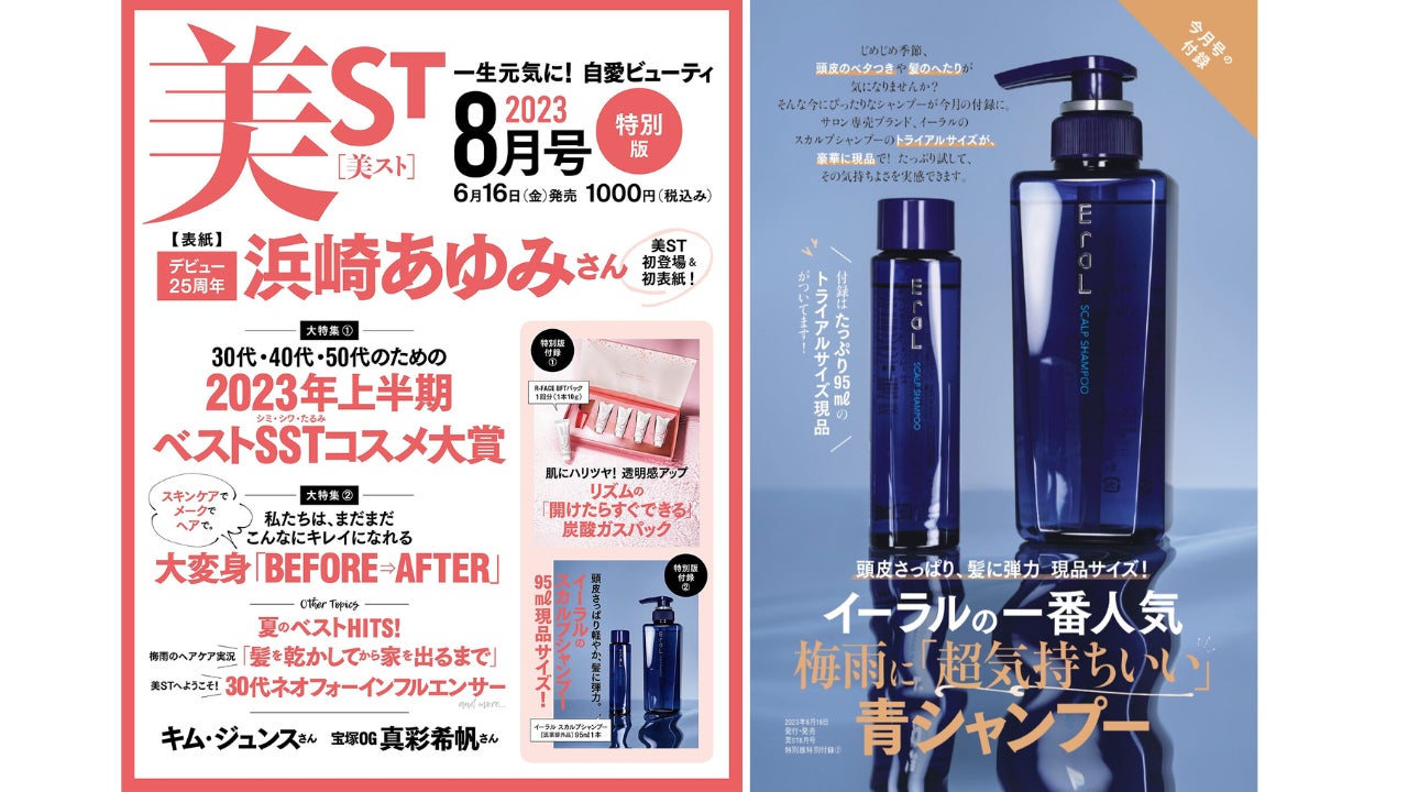 誌面では美ST初登場&初表紙で大注目の浜崎あゆみさんをはじめ「2023年上半期ベストSST(シミ・シワ・たるみ)コスメ大賞」「梅雨のヘアケア実況 髪を乾かしてから家を出るまで」など2023年上半期の締めくくりに大注目のエイジングケア特集など充実した内容となっております。