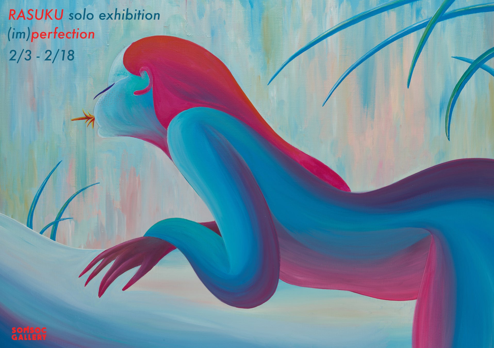 RASUKUは今現在、デジタルという表現から、アナログによる表現へと手法を変化させている。また、最近はホイジンガの「人間は遊ぶ存在である」という主張に影響を受け、「遊び」の瞬間をキャンバスに収めることを新たな課題としている。RASUKU自身がどのように変化し、この展示においてどのように遊ぶのか。今回は現在変わりつつあるRASUKUの遊びをSOMSOC GALLERYという空間に保存する。来場するみなさんには、彼の作品中の「(im)perfection」、(不)完全な存在である人間に寄り添って、その作品の魅力を見ていただきたいと思う。