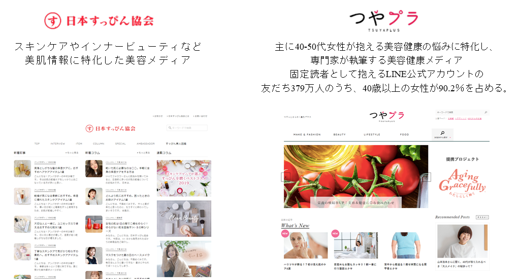 スキップ社は、379万人の固定読者を保有する40~50代女性向け美容健康メディア「つやプラ」(https://tsuyaplus.jp/)と美容メディア「日本すっぴん協会」(https://suppin.info/)の運営を主力事業とし、メディア運営の他、メディアの読者データを活用したマーケティング支援を手掛けております。