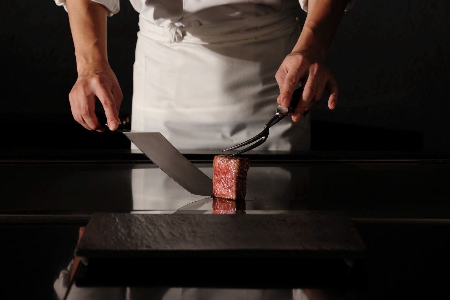 「鉄板焼 北野」の料理長 野上はコースメニュー構築において食材の組み合わせと順序に重要性を置いています。食材の淡白な始まりから味わい深い進行で、料理の調和を追求した料理を提供します。