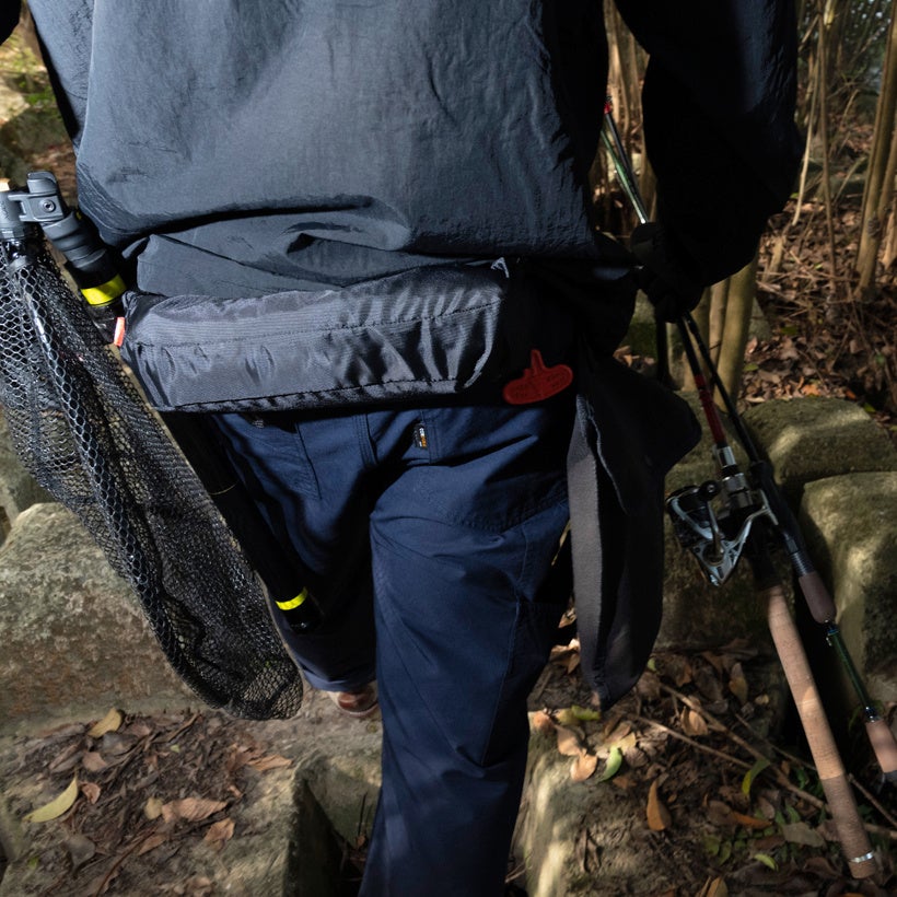 左右どちらの腰にも「ランディングネット」を挿すことが可能。※Fishermans Workpants HASU®(NTP)ネイビー着用