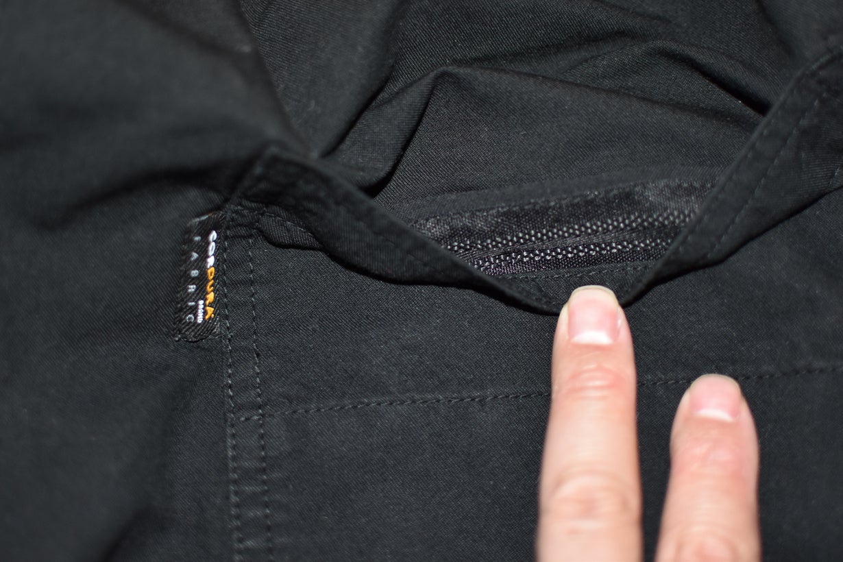 滑りの良い素材を使っているので、屈んだりする際にはメリットになるのですが、後ろのポケットに入れたモノが座った際などに"ごく稀に"滑り出てしまうことがあると言うデメリットもありました。それを防ぐために後ろポケット内側上部に「滑り止め」をつけました。ポケットからモノを取り出す際には、手の甲側にくるので取り出しやすさはあまり変わりません。
