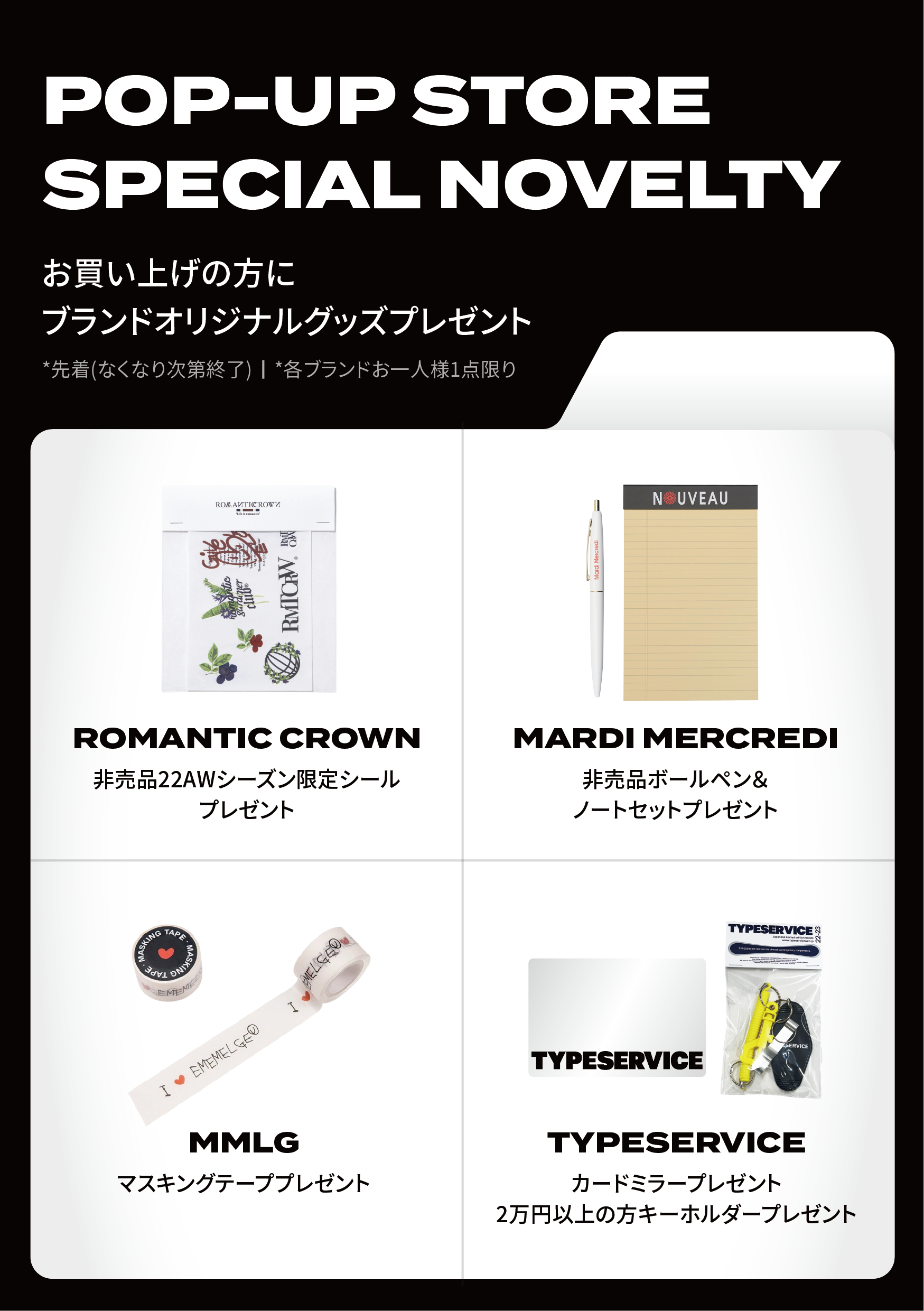 Mardi Mercredi・TYPESERVICE・Mmlg・Romantic CrownからPOP-UP STORE開催期間中にご購入されるお客様にブランドオリジナルグッズをプレゼント。